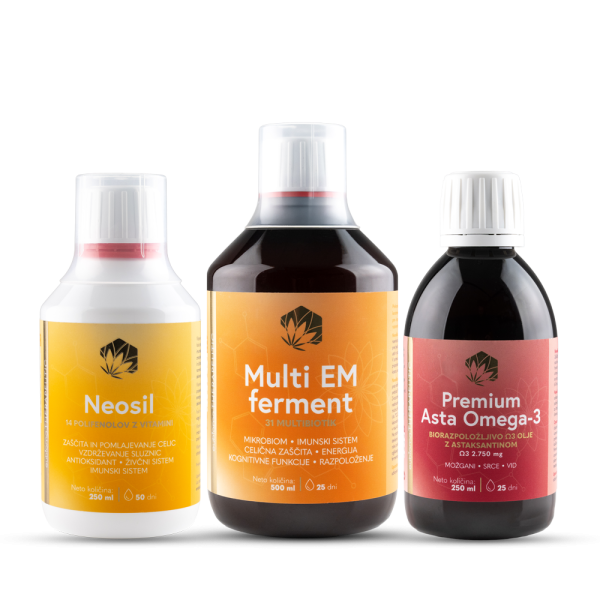 Paket vsebuje naslednje izdelke: Multi EM ferment® 500 ml, Neotosil 250 ml, Premium Asta-O3 250 ml