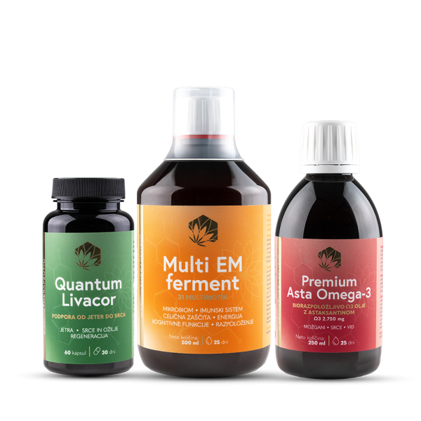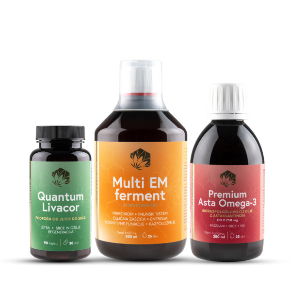 Paket združuje tri skrbno izbrane izdelke z dokazanim učinkovanjem in usklajenim delovanjem za hkratno podporo mikrobioma, jeter in srca – ključnih mest, kjer se najpogosteje tiho razvijajo zdravstvene težave sodobnega časa.