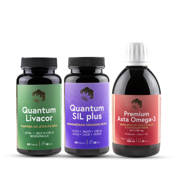 Zamašene žile se ne začnejo z maščobo – ampak z vnetjem, oksidacijo in izgubo elastičnosti. Paket OŽILJE združuje tri napredne formule, ki celostno naslovijo ključne dejavnike sodobnih žilnih težav. Livacor podpira jetrno presnovo in odstranjevanje presežkov, QuantumSIL Plus s sinergijo silicija, bora in C-vitamina vpliva na žilne stene, prekrvavitev in celično ravnovesje, medtem ko Asta Omega 3 z visoko vsebnostjo čistih omega-3 maščobnih kislin v obliki trigliceridov in dodatkom astaksantina prispeva k ohranjanju prožnosti žil, uravnavanju in zaščiti celic pred oksidativnimi poškodbami. Skupaj delujejo kot naravni ščit – za pretočnost, elastičnost in dolgotrajno zdravje ožilja.