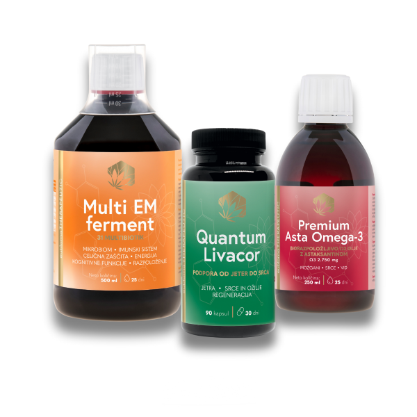 Paket združuje tri skrbno izbrane izdelke z dokazanim učinkovanjem in usklajenim delovanjem za hkratno podporo mikrobioma, jeter in srca – ključnih mest, kjer se najpogosteje tiho razvijajo zdravstvene težave sodobnega časa.