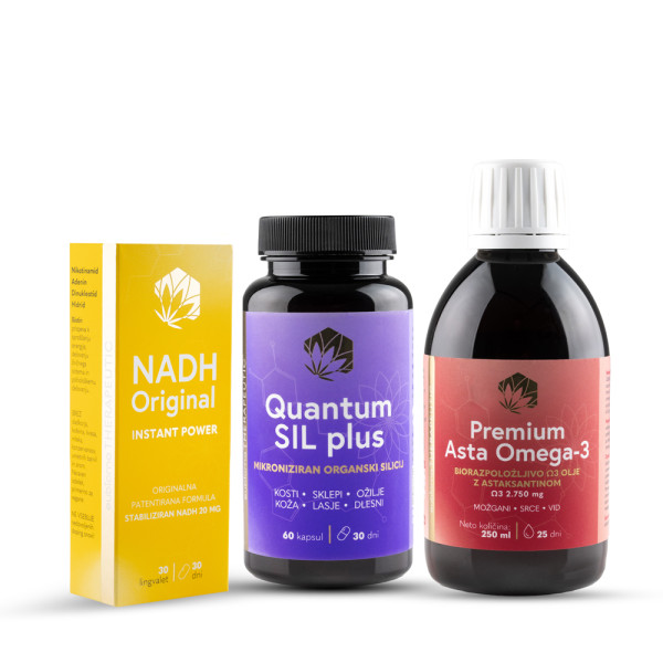 Paket vsebuje: QuamtumSIL PLUS 60 kapsul, NADH Original Instant Power 30 lingvalet in Asta O3 250 ml |