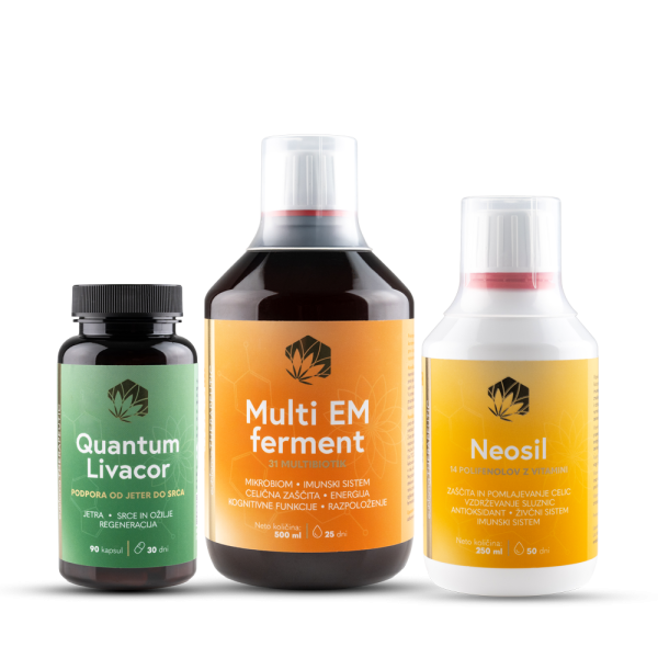 Holesterol ni težava sam po sebi – postane težava, kadar telo izgubi sposobnost njegovega uravnavanja. Neravnovesje v črevesju, prehrani in presnovi lahko vpliva na to, kako učinkovito telo vzdržuje ravni lipidov. Paket LDL STOP je namenjen posameznikom, ki želijo naravno podpreti notranje mehanizme uravnavanja holesterola, še preden pride do večjih sprememb v ožilju. Livacor podpira jetrno presnovo in odstranjevanje presežkov, Multi EM ferment pomaga vzdrževati ravnovesje mikrobioma, Neosil pa z antioksidanti in ključnimi mikronutrienti prispeva k zaščiti celic pred oksidativnim stresom. Skupaj omogočajo premišljeno in dolgoročno podporo telesu za lažje ohranjanje notranjega ravnovesja maščob.