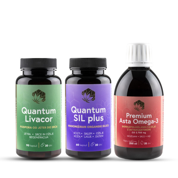Zamašene žile se ne začnejo z maščobo – ampak z vnetjem, oksidacijo in izgubo elastičnosti. Paket OŽILJE združuje tri napredne formule, ki celostno naslovijo ključne dejavnike sodobnih žilnih težav. Livacor podpira jetrno presnovo in odstranjevanje presežkov, QuantumSIL Plus s sinergijo silicija, bora in C-vitamina vpliva na žilne stene, prekrvavitev in celično ravnovesje, medtem ko Asta Omega 3 z visoko vsebnostjo čistih omega-3 maščobnih kislin v obliki trigliceridov in dodatkom astaksantina prispeva k ohranjanju prožnosti žil, uravnavanju in zaščiti celic pred oksidativnimi poškodbami. Skupaj delujejo kot naravni ščit – za pretočnost, elastičnost in dolgotrajno zdravje ožilja.